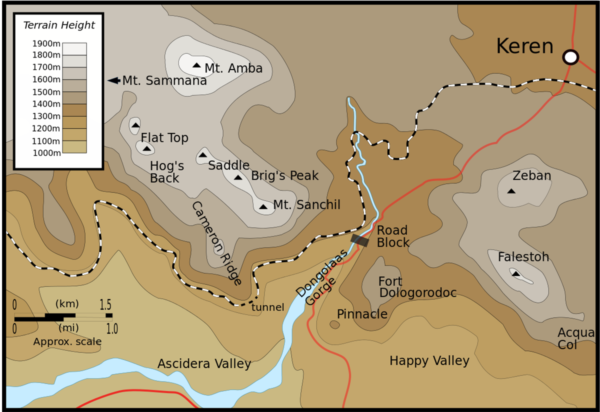 The terrain in the Keren highlands favoured the defenders in the extreme. Dug in amongst the steep granite ridges, the Italian forces had perfect sightlines for their artillery and plentiful natural cover to protect them from incoming fire.