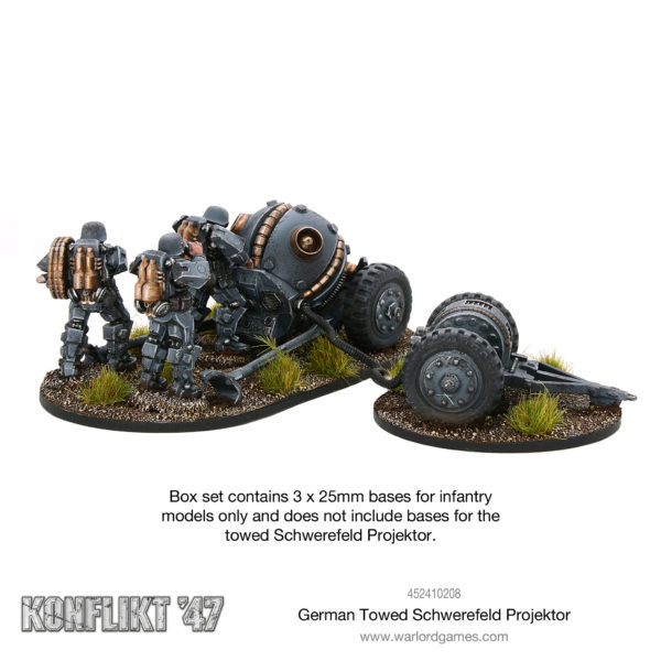 German scientists have developed the utility of their rift weaponry further by creating a new towed variant of the Schwerefeld Projektor. Although it required a small generator trailer to make it independent of a larger powerpack or vehicle, the weapon was well received.