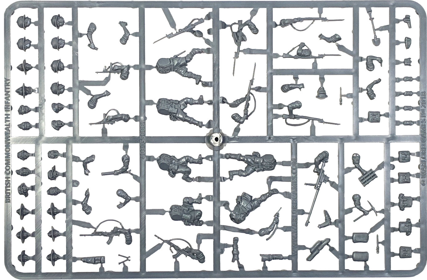 30 British Commonwealth miniatures. Includes a host of options to allow for different weapon configurations and command models. - Equipment included: Lee Enfield rifle, Thompson submachine gun, Bren gun LMG, Boys anti-tank rifle, Webley pistol and 2-inch mortar
