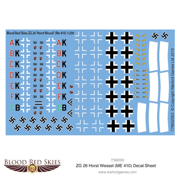 This waterslide decal sheet contains markings to decorate 6 planes in the markings of ZG 26 Horst Wessel (Me 410).