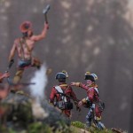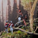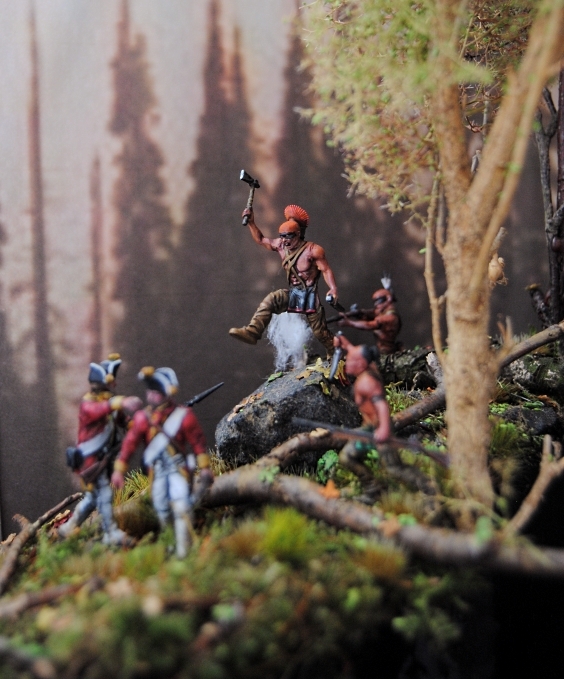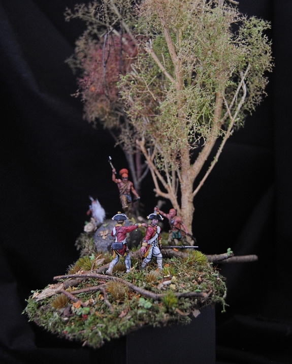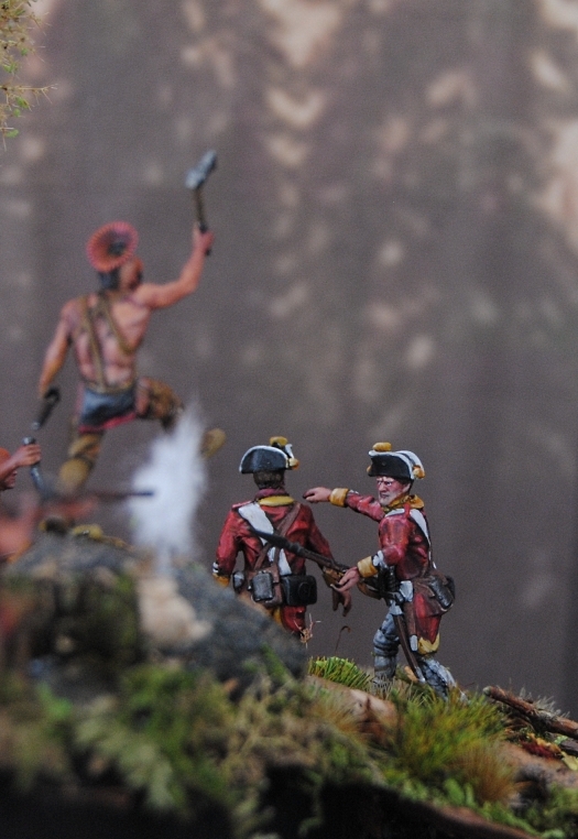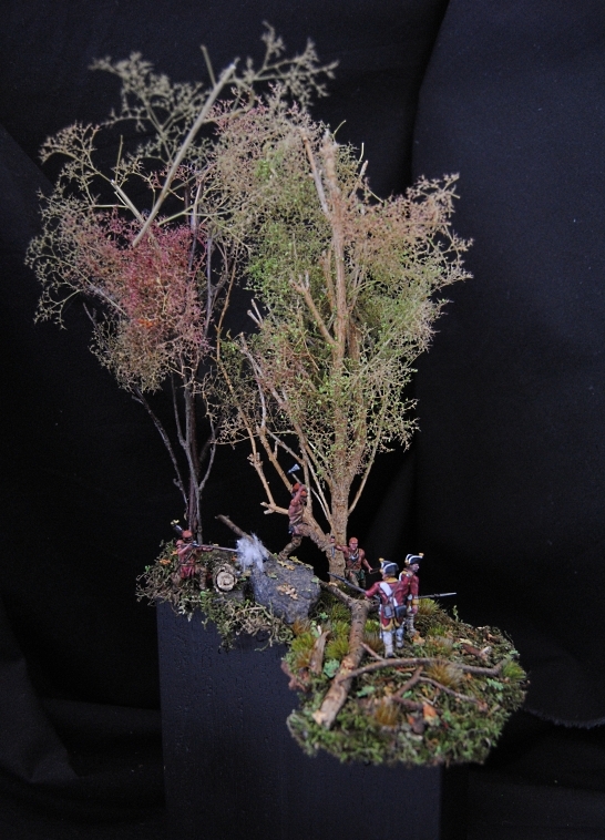 The diorama-scenery shows British soldiers being ambushed by native Americans. This diorama should capture the moment before the attack as well as the untouched, splendid and also dangerous natural North American landscape.