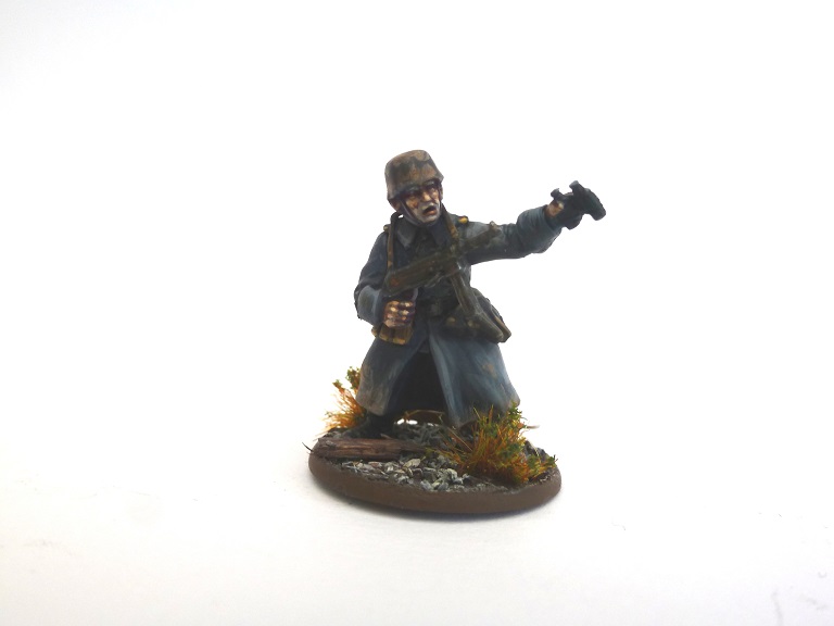My Lieutenant was made using a great coated Russian from the Winter Russians set, as well as arms, head and pouches from the Fallschirmjӓger set. To make the uniform a little more accurate I carved off the Russian straps and reshaped the back with green stuff to more closely resemble the German greatcoat, and then used green stuff to sculpt on new cuffs.