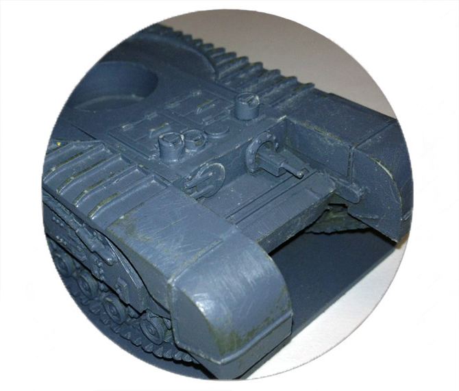 I wanted to have the model painted in standard German dunkelgrau while having the green of its original British/Soviet paint-job showing through at certain places. The model was primed with a dark olive drab aerosol spray primer. After several thin coats to ensure adequate coverage, the model was sprayed with a healthy coat of gloss varnish, then with two thin coats of hairspray (taken from the wife’s beauty cabinet of course). Once the hairspray was dry, I sprayed the model with two coats of a medium grey aerosol spray primer. The gloss varnish acts as a solid barrier to chipping while the hairspray allows the grey primer to chip away with water. Using a tooth pick, an old tooth brush, and some water, I began to lightly chip away at the grey primer in areas that would have received more wear and tear than others: fenders, engines hatches, turret ring etc. At times I was unable to avoid chipping through to the bare resin, but this will get covered up later.