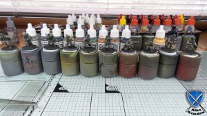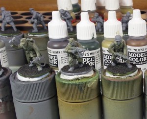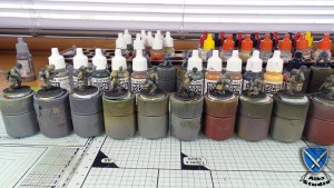 Here they are after a total of 90 minutes painting time and a couple of hours drying time. The figures get a dunk in my own recipe of dip. I’ve experimented to a point where I feel it’s quicker drying that other commercial types and is quite thin. Even though it is quite quick to dry it is best to leave the figures overnight to ensure it is dry. I find that the colours never seem right to me until they have been sprayed with matt varnish so I ignore how they look and press on with the faces and hands.