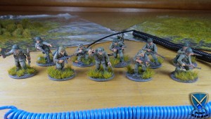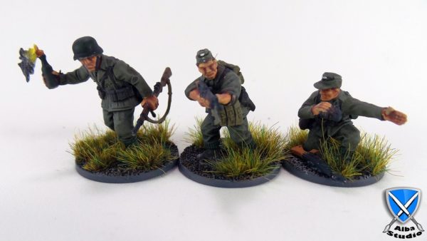 88 minutes in and the figures have Vallejo 920 German Green used for gaiters and Zeltbahn rolls. The wooden parts of rifles are painted using 983 Flat Earth, 981 Orange Brown is used for the wood on the assault rifles as I like the contrast. All the metal parts are 995 German Grey.