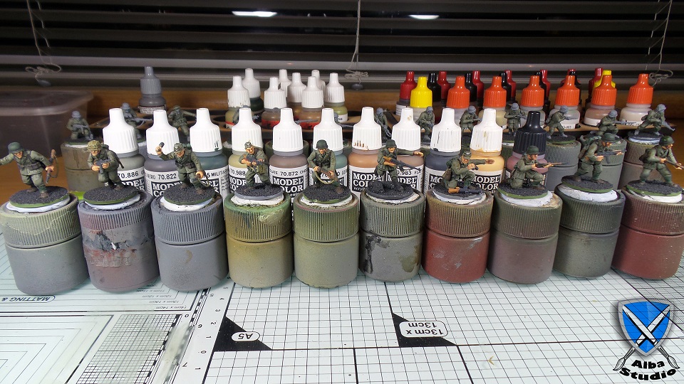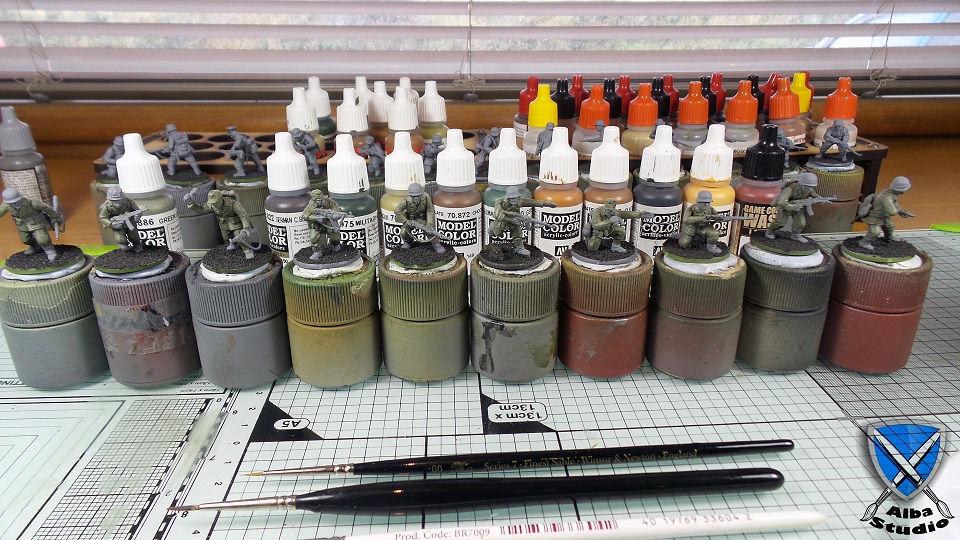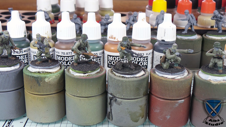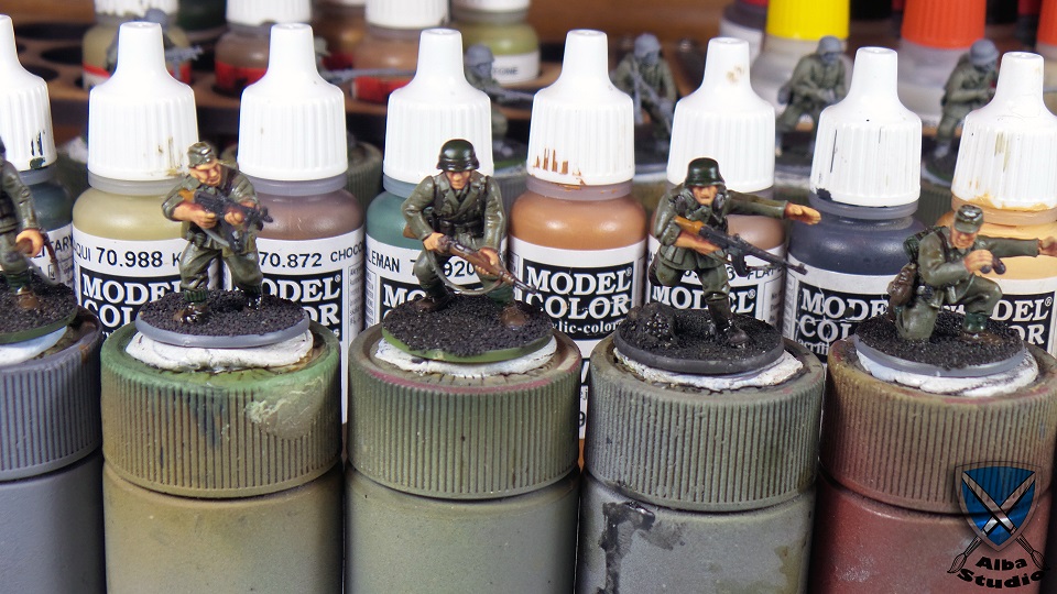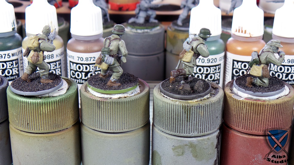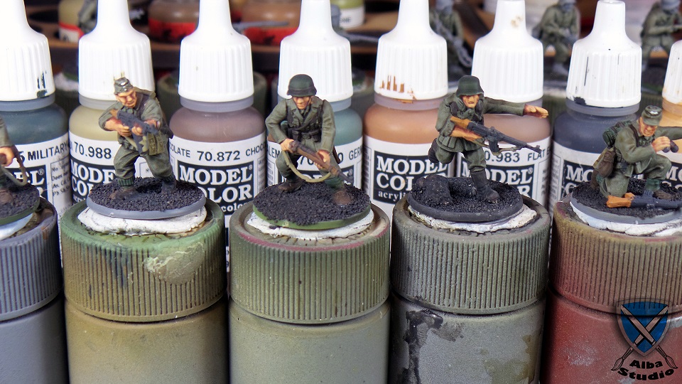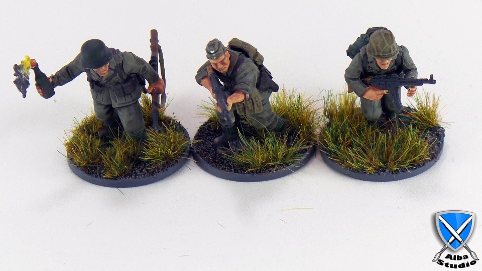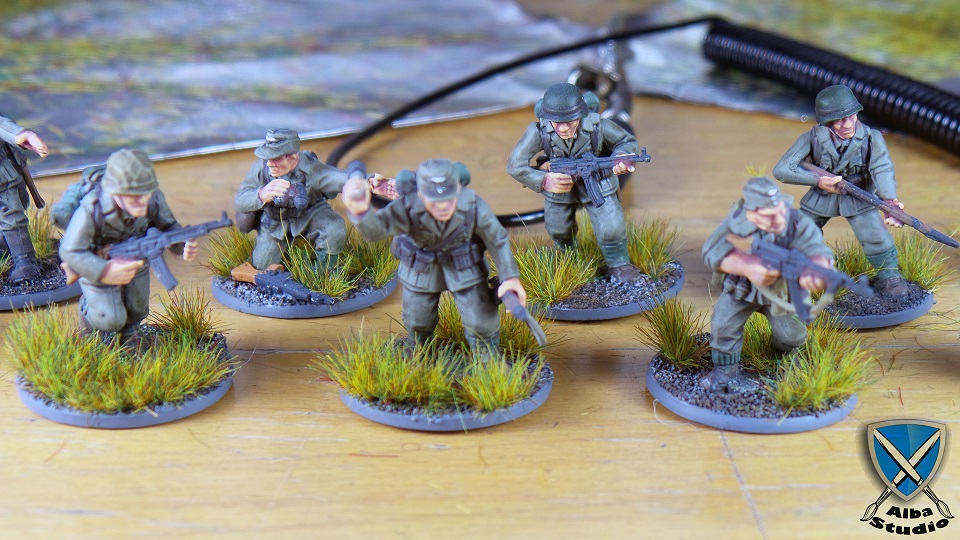 88 minutes in and the figures have Vallejo 920 German Green used for gaiters and Zeltbahn rolls. The wooden parts of rifles are painted using 983 Flat Earth, 981 Orange Brown is used for the wood on the assault rifles as I like the contrast. All the metal parts are 995 German Grey.