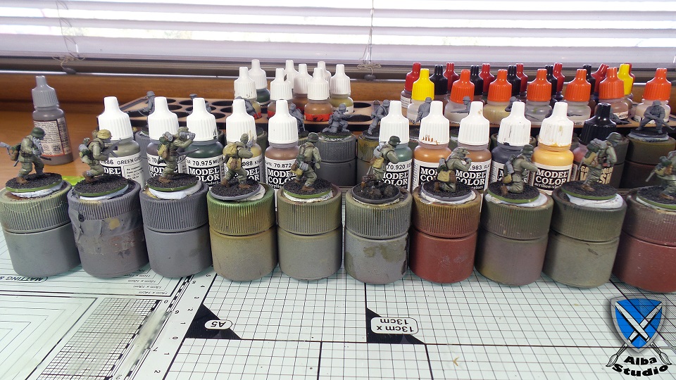 The paint job took a total of 130 minutes, excluding drying time. I will finish off with some Drybrushing of the base and then adding static grass. Here at Alba Studio we have a “Heath Robinson” device to make the static grass stand up but flock and self-adhesive tufts work as well.