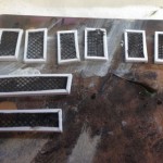 The construction of the frames themselves is fairly simple. Using L shaped polystyrene rods (1/16″) I made a series of small frames, measured to place over the turret sides, top, rear, as well as hull sides. Into these frames were placed some window screening, which was intentionally distressed. As this model is intended for handling and not just display, I wanted the frames to be durable. Therefore I did not just glue them onto the surface of the vehicle. I drilled a series of holes (one for each frame corner) directly into the model, with the idea that each frame would be pinned in place.