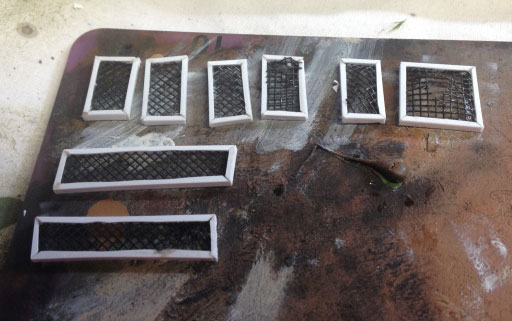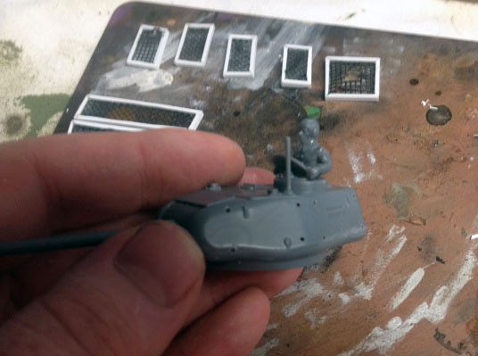 The construction of the frames themselves is fairly simple. Using L shaped polystyrene rods (1/16″) I made a series of small frames, measured to place over the turret sides, top, rear, as well as hull sides. Into these frames were placed some window screening, which was intentionally distressed. As this model is intended for handling and not just display, I wanted the frames to be durable. Therefore I did not just glue them onto the surface of the vehicle. I drilled a series of holes (one for each frame corner) directly into the model, with the idea that each frame would be pinned in place.