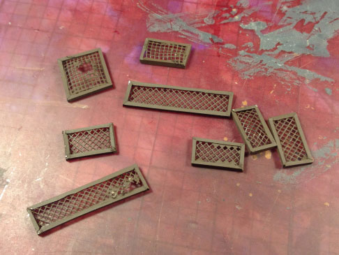 From this point I painted the vehicle as normal. I will not get into detail on the paint colours or techniques used, as that is not the main topic of this article. With the model now painted, I set about fixing the frames to the vehicle. I created small connecting bars from ornament wire (small gauge wire), and bent them into shape and glued them in place. The already primed frames (in a dark brown) were glued to these bars. Once the glue was dry, I basecoated the wires very carefully with the same dark brown as the frame. The frames were then detailed with alternating drybrushes of dark metallic and medium rust, finishing it with a bright rust colour.