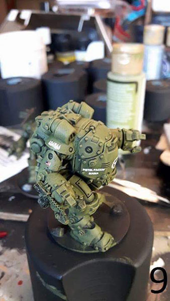 Use a lighter green, I used 527 Forest Moss from Folkart (the left Jackal has been dry brushed with the lighter green and the right Jackal hasn’t).