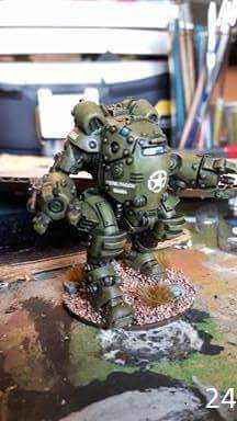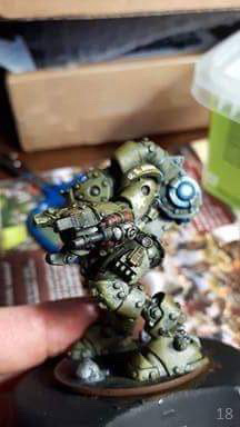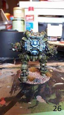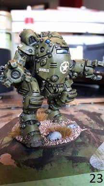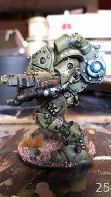 I put some gloss varnish on the windows and the jetpack reactor zone and finished the base. For the base I used Army Painter Brown Battleground and the grass tufts are from the Army Painter Highland tuft.