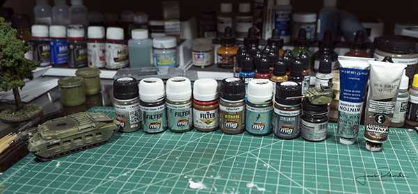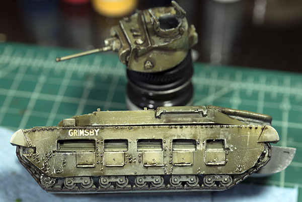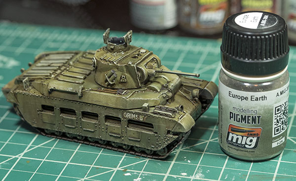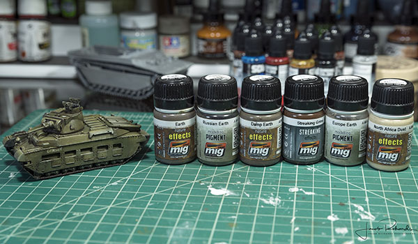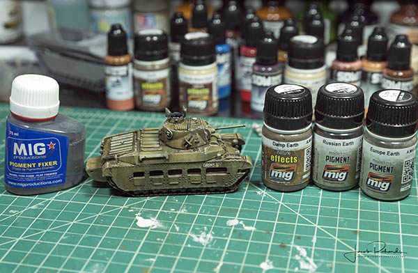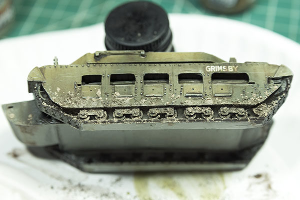 The final element I added to the tank was mud. I used various pigments and applied them with pigment fixer. I put the pigments in place by using a tapping motion over the lower hull of the tank. I started with lighter pigment to show drier mud and then used darker pigments towards the bottom (near the tracks) for wetter mud. Once the pigments were to my liking, I gently dropped the fixer around the pigments and let them absorb the fixer.