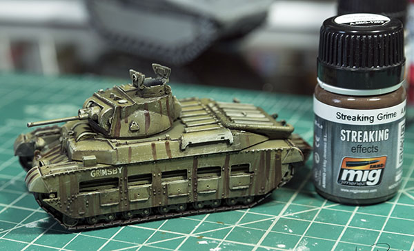 I wanted to emulate the various amount of darker soils that would accumulate on the tank and then run off during rain. I took Ammo’s Brown Streaking Grime and applied it in lines around the tank. Like the panel wash, I let this dry for about 45 minutes and came back with a damp brush to think the streaks and make them look much more natural. Use this effect sparingly. Less is more!