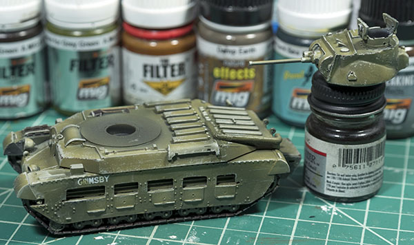 With the filters established, I then used Ammo’s Brown Wash for Green Vehicles to outline panels and components of the tank. I used the capillary action of the wash to let it flow around the various features of the tank. I then let the wash dry for about 45 minutes and then came back with a brush dampened with thinner to clean up the wash so that it created subtle outlines around the different features.