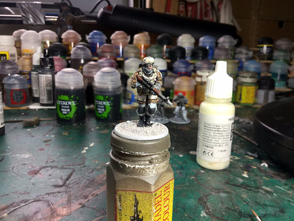Paint the base with Vallejo “Burnt Umbra”. Then add some Vallejo “Ivory” to the “Burnt Umbra and give the base a quick dry brushing. Glue some grass tuft onto the base and cover everything with some snow effect (Games Workshop Valhalla Blizzard in this case). Once this is dry repaint the edge of the base with Vallejo “German Field Grey”.