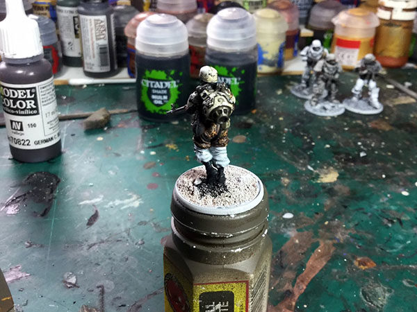 Repaint the face, camo-smock, ammo-pouches, water bottle, gunstock, scarf and gloves with their original base colour leaving only the recesses in the darker colour. Add highlights on the raised parts of each item by mixing some Vallejo “Ivory” to your respective base colours.
