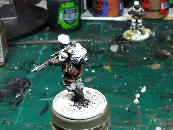 Repaint all the armour, the anti-grav module and helmet with pure white (Vallejo “white”). It’s best to apply several thin coats of white building up to a pure white around the edges. By doing so the darker base colour will still be visible where some shading may be needed. Note that the trousers are not repainted white at this stage.