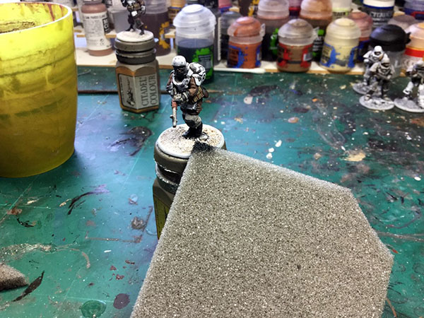 Now it´s time for some weathering to make the armour look well used. For that purpose, a piece of packing- foam is ideal. Dip the corner of the foam into Vallejo “Black Grey” and then onto some piece of cloth to remove some of the paint. Then carefully go over the armour, helmet and anti-grav module and lightly tap the corners and edges with the foam. This will create a nice and random chipping effect.