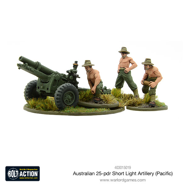 The ubiquitous 25-pdr was the standard artillery piece of the Australian Army in the Pacific Theatre, as it had been in the desert. The complete lack of roads and the dense jungle terrain encountered on the Pacific islands meant that deploying these guns was extremely difficult.