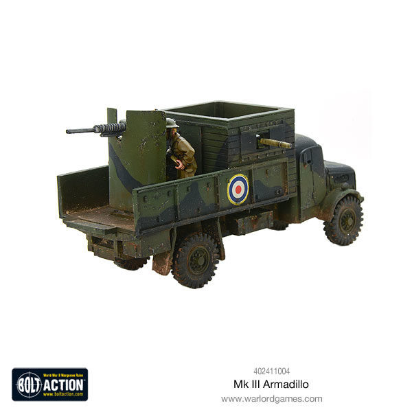 Armadillos were improvised armoured self-propelled guns based on any available lorry chassis for airfield defence. The ‘armour’ consisted of wood and/or steel plates lined with gravel. The Mark I and II were armed with two Lewis Guns mounted in an open-topped ‘fort’, plonked onto a flatbed lorry that itself lacked even an armoured cab.