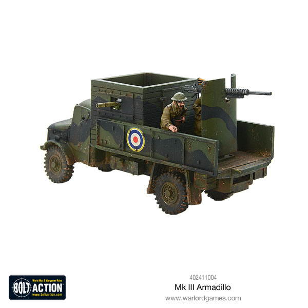 Armadillos were improvised armoured self-propelled guns based on any available lorry chassis for airfield defence. The ‘armour’ consisted of wood and/or steel plates lined with gravel. The Mark I and II were armed with two Lewis Guns mounted in an open-topped ‘fort’, plonked onto a flatbed lorry that itself lacked even an armoured cab.