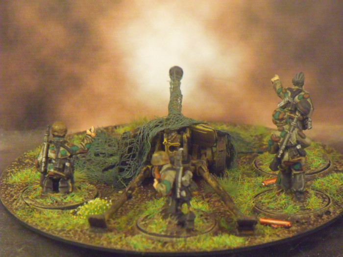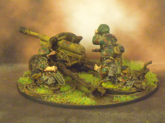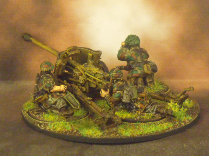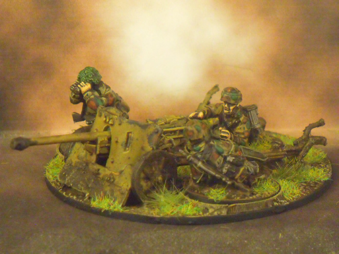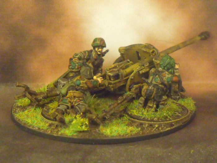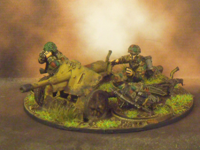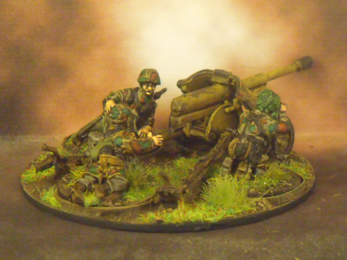 The Pak 38 is a fairly straightforward model, fitting onto my usual 60mm round team base. As with the other three guns (and the rest of my Fallschirmjager army for that matter), I went for a beaten up and well used look. This was accomplished via the “sponge method” of weathering which I hope to detail in a later blog post. The crew being used on this model are actually from my panzerbusche 41 team.