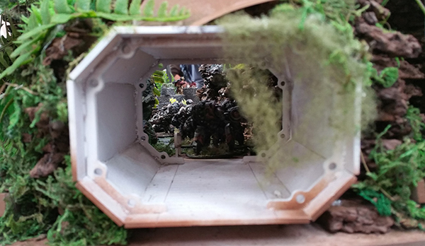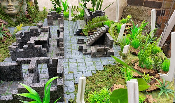 The buildings were then scratch built using various Mayan ruin pictures as a rough guide and frame of reference. We wanted to make sure that the buildings were not just eye catching terrain but terrain that could be used to house troops inside and at different levels for perfect firefight opportunities. The buildings and their ultimate layout provided not just cover but lines of fire as well depending on where the opposing factions were on the board.