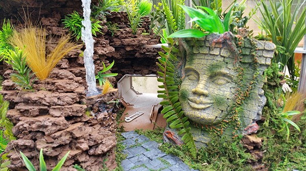 To achieve the waterfall effect we piped silicone sealer in strips on a non-stick surface and used a cocktail stick to mix it up to form a falling water effect. Then, when dry, we stuck it in place with more clear silicone sealer. The waterfall pool and water pool were filled with a clear liquid resin that did leak out onto the rocks and baseboard but overall added to the effect.