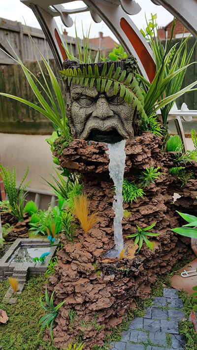 The cork was pushed in to the Oasis blocks and glued in place and gave a great rough rock-like appearance to the overall build. From the start we wanted a little waterfall from the top of the dome falling in to some form of natural rock pool near the bottom.
