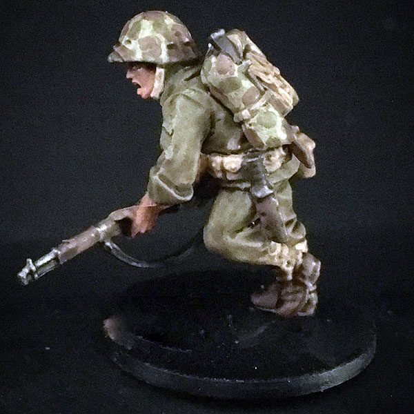 The next step is the wash. Shoes and rifle as well as K-bar and bayonet with Nuln Oil, everything else Agrax Earthshade. Go light on the helmet cover and ground sheet as you don’t want to obscure the ‘intricate’ (albeit heavily simplified) camouflage 😉.
