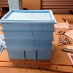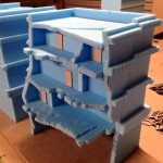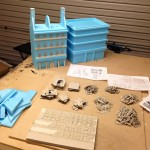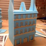 Several group terrain days have kicked off the terrain making process so the board is nicely under way now. The buildings have been designed to be built with ease and quickness in mind. The main structure is 10mm underfloor insulation foam, simply cut to shape with a blade and glue gunned together. The beauty of this material is that details can be scored into the surface, such as bricks, wooden flooring etc. We’re also in the fortunate position of having members with access to laser cutters, and they have created hundreds of windows and doors to give the buildings that extra depth. All of which is to be painted and finished at our next group terrain session shortly.