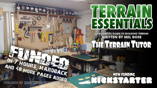 Dave & Mel are using this Kickstarter campaign to fund a printed version of the book – Terrain Essentials – a 96+ page book perfect to add to the collection of anyone with an interest in creating excellent tabletop terrain, regardless of purpose or the builder’s ability.