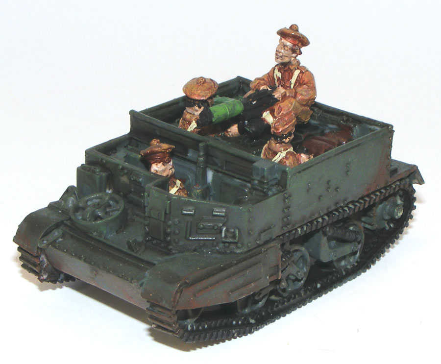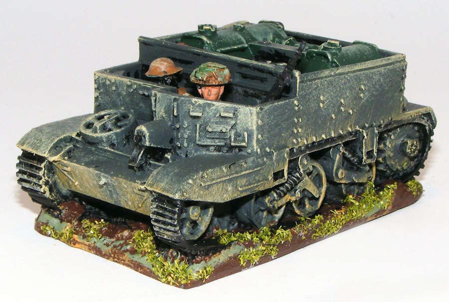 No-one can resist adding vehicles to their Second World War force and John is no exception! He has started with an evil-looking flame thrower armed Carrier, the Wasp. He’s added a few back packs on the side as stowage and a captured MP40 sub-machine gun next to the gunner for those close quarter encounters. He has heavily weathered the carrier with a lot of mud and dust common to all tanks and vehicles in WWII.