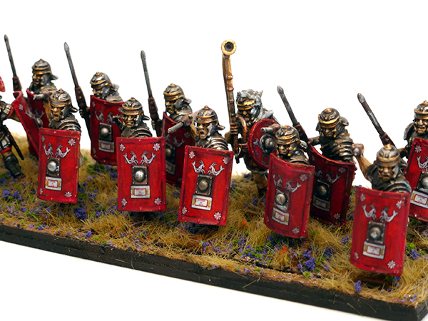 Painting the Romans so far has proven a very interesting experience. Whilst the force looks large and intimidating to start with, now that I’m about half way through it’s actually proving relatively simple. The most important thing to constantly remember is that you are painting a block of troops rather than individual display pieces, so basing and shields take on a huge importance, and luckily transfers can make the work very quick and simple (For the shields, decals for basing sounds like some kind of witch craft).