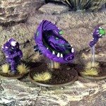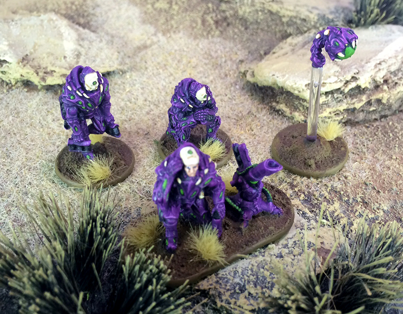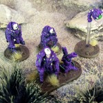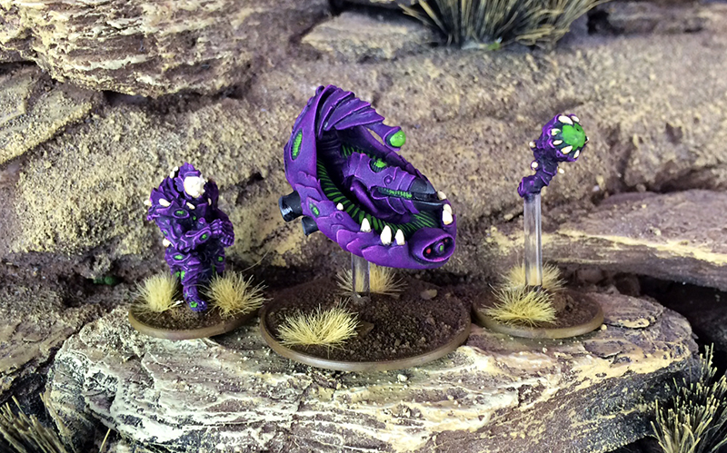 I normally go for bright paint schemes, but liked the idea of a darker scheme for the Isorians. I went with a dark purple, with light green as the contrast colour. I liked the white face plates on the studio models, so kept that theme and added a bone colour for some of the organic parts used on the armour. With these ideas I left Rob to do his magic. They turned out spot-on and I love the final look of my army, they’ve also been based to match the 500 point scouting force of Boromite mercenaries that I have collected to serve the Isorians.