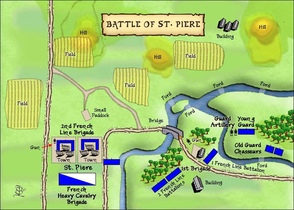 Unbelievably the head-strong commander of the French Guards advanced the single battalion of Young guards to the river line to hold a ford without any support! They suffered severely and were broken when Paul’s three British regiments advanced and poured fire into them. Around the same time, the head of the Brunswick attack was obliterated when the first battalion across the ford was canistered by the two batteries of Guard artillery.
