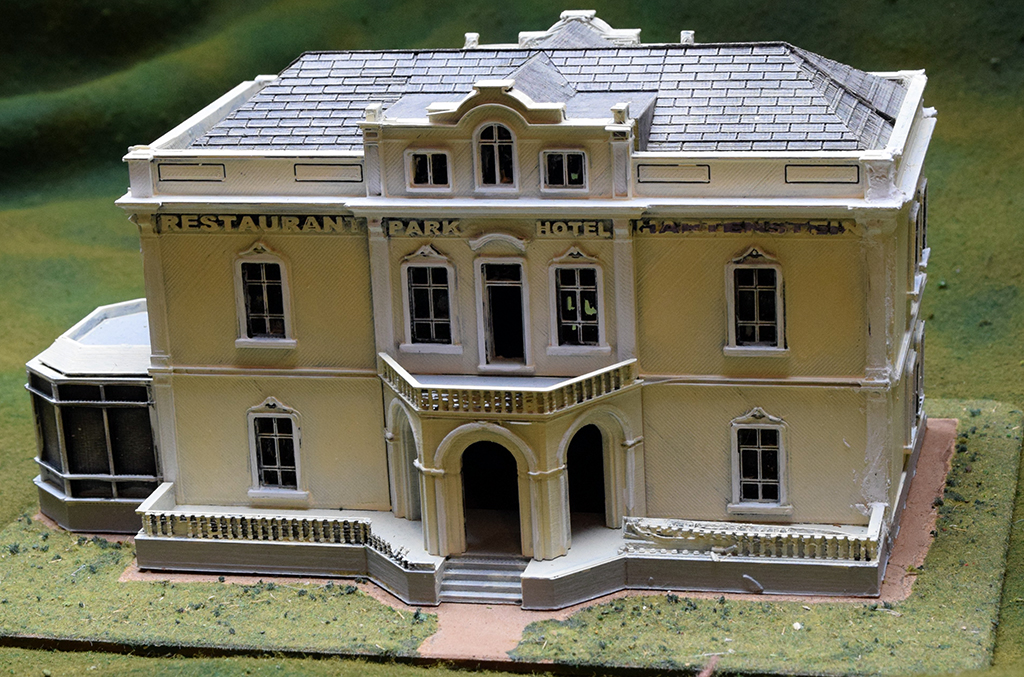 Of course not all buildings are quite so flexible. The large white Art Deco piece with the semi-circular balcony (courtesy of Geoff Lacey at Purple Lion Creations) is a representation of a very specific structure; the Rhine Pavilion at Arnhem. It was a very popular stop-off for pleasure cruisers on the Rhine from 1935 to 1940. In common with about 200 other Arnhem authors I have written that the Pavilion was destroyed in the fighting; it one of those things that ‘everybody knows’. Not only is this untrue, but is now part of the NH Rijn Hotel my wife Pat and I have stayed there many times and fought a lot of Bolt Action battles on that big round balcony. Incidentally, Arnhem enthusiasts may want to join a group of us at the hotel for the commemorative weekend 21-23rd September – lots to do and see during the day and great big Arnhem wargames in the evenings.