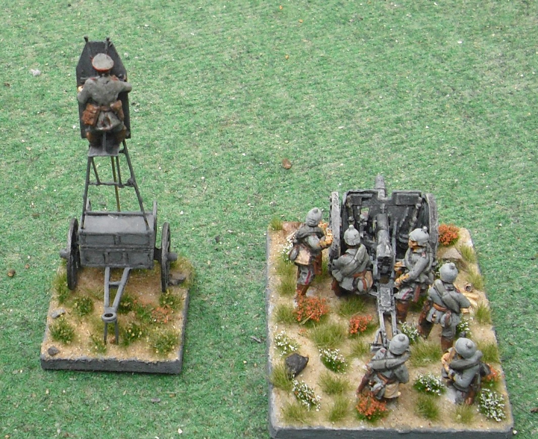 1897 the French rocked the world’s artillery community with the introduction of the canon de 75. The first one with a working recoil mechanism. The “jumping” older ones fired 2-3 aimed rounds per minute. The 75mm fired fifteen rounds per minute on target, for a short time even 30 had been possible. The crew was protected by a shield and the ammunition wagon was armored, giving additional protection.
