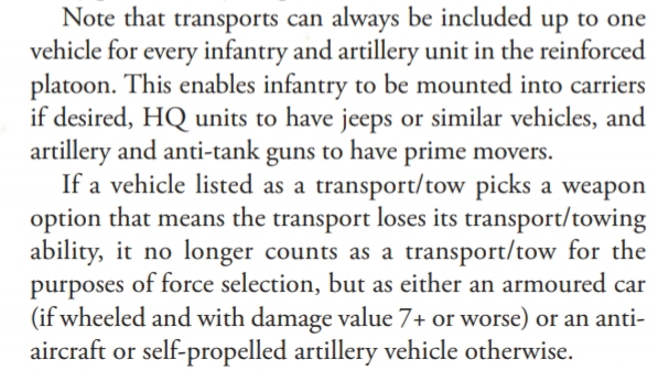 However, in the case of a Truck or a Halftrack, one is able to add either HMGs or MMGs as appropriate, and the transport still retains the ability to transport troops. I just don’t remember where this is in the rules at the moment.