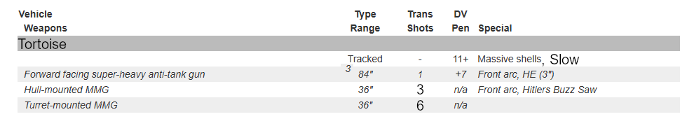 With the upcoming new edition of Konflict 47, I have been doing some research about how to include the Tortoise into Bolt Action. I was wondering if someone who is more experienced with the game could take a look at my homebrew specifications (attached)? They are based loosely on the German Jagdtiger stats, and I have tried to marry real-world specs with game balance.