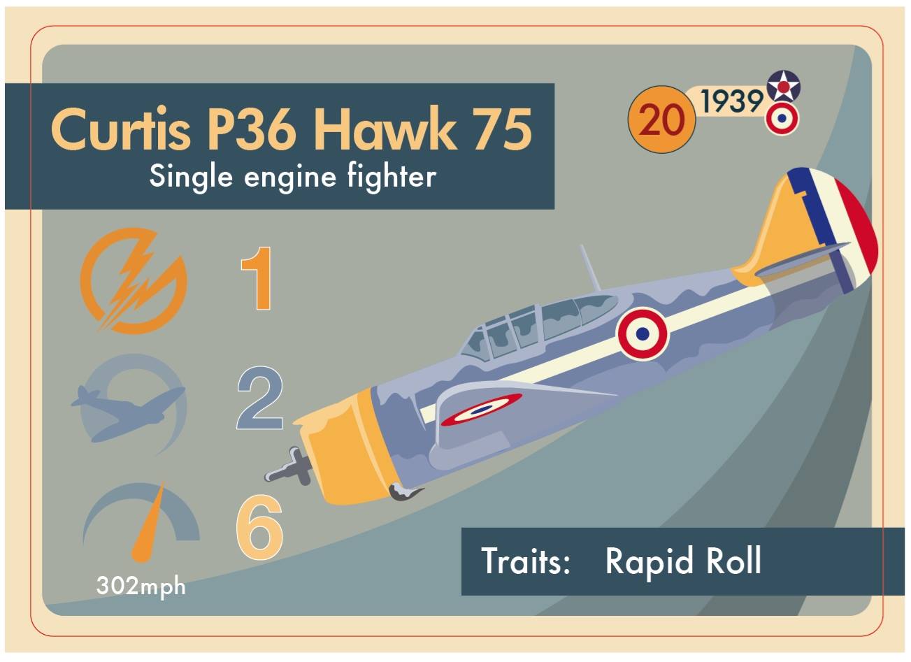 ParticipantAnother “Ready Room” Leak of the Week. Here is the almost forgotten Curtis Hawk 75. It’s a fascinating little plane that saw a surprising amount of service. The H75s proved to be the most effective fighter in French service during the Battle of France, accounting for around a third of the claimed kills. They also saw action in both Vichy and Free French hands, in China under the Nationalists and in The Dutch East Indies against the Japanese. Captured French examples were sold by Germany to Finland who used them against the Soviets. The RAF used them for training. The USAAF flew them as the P36, but they only saw action at Pearl Harbour, where six P36s accounted for two A6M2 Zeros for the loss of one of their own. We have chosen to use the French version as our example, but although there are minor changes in specs and equipment this can also stand in for the others. In BRS the H75 is a nice little plane, very manoeuvrable, but the lack of speed means that it will always be at a tactical disadvantage against most opponents. Thanks again to Martin Evans for the rather beautiful card graphics. As always give it a try and tell us what you think. Cheers