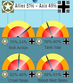 Richard CoatesParticipant“After tapping our combat gauges we can get the latest results from our D-Day Campaign. Allied infantry are leading the charge inland from the beaches of Normandy. It’s slower going for the armoured columns, with only occasional fighting in the air overhead. The seas are also relatively calm, with the majority of skirmishes being won by the Allied navies. Overall, the Axis powers are being pushed back, their stranglehold on Normandy beginning to weaken; there’s still a long way to go however.”