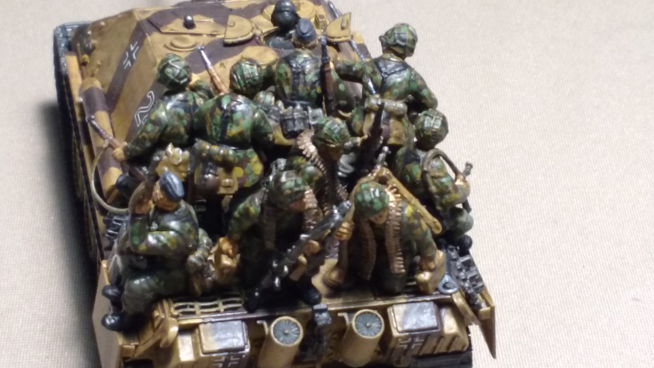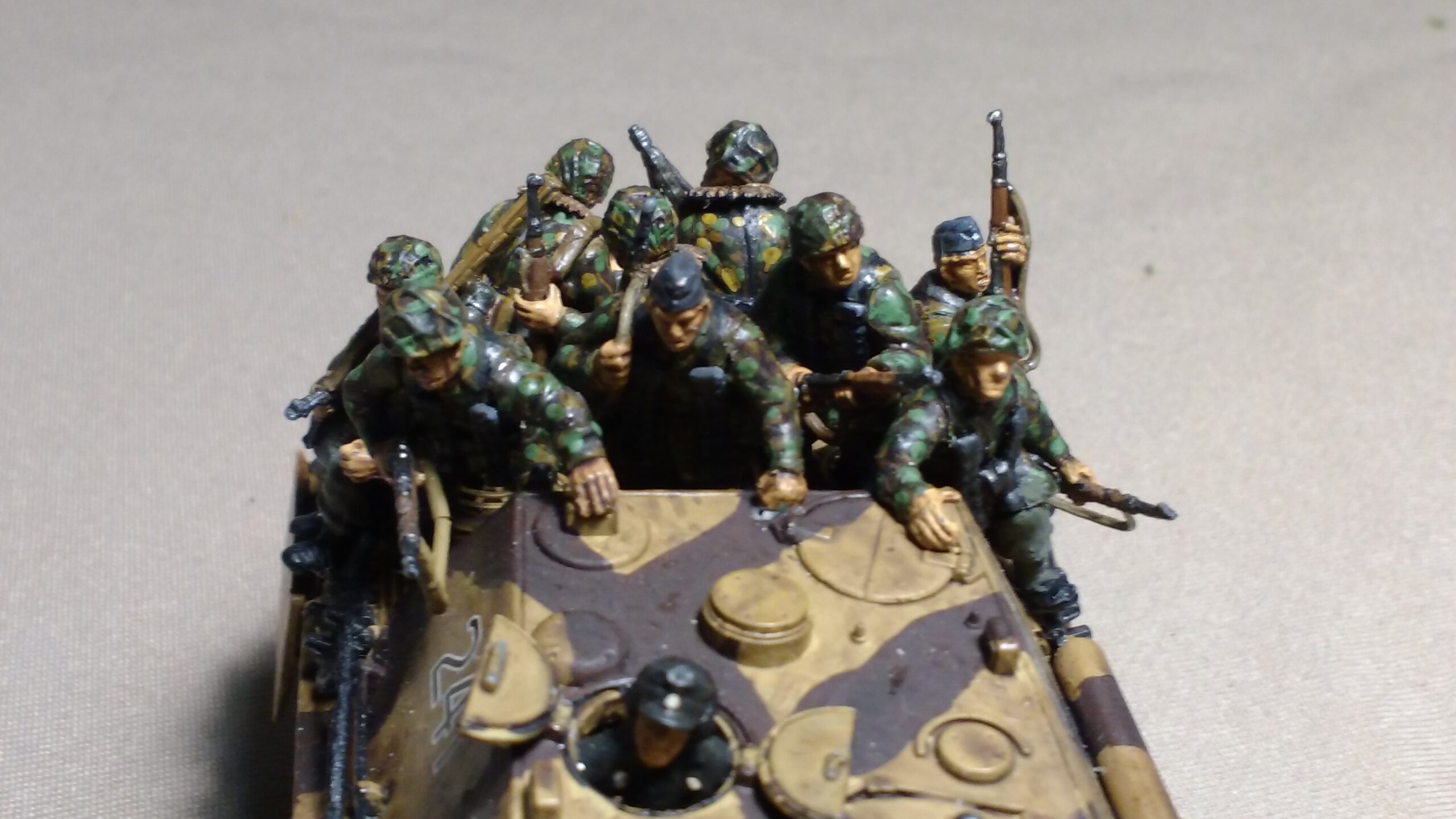 I finally got around to adding tank riders to my extra JPanther hull , I got 9 figures to fit . The 4 standing figures had their legs swapped around , the 2 seated figures used the upper torsos from the FJ kit and the legs with short boots from the plastic seated German set . I used the legs with the jack boots on my seated Russian figures . So much easier than trying to covert standing to seated figures so watch out for them during the Sprue sales . The 3 man kneeling MG team are loose so can be used on the table top . It was a bit trial and error getting the look I wanted , I ended up using arms from most all of the German plastic sets .