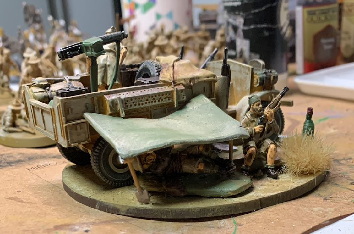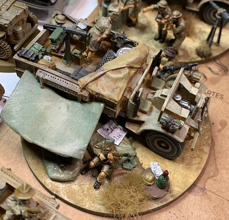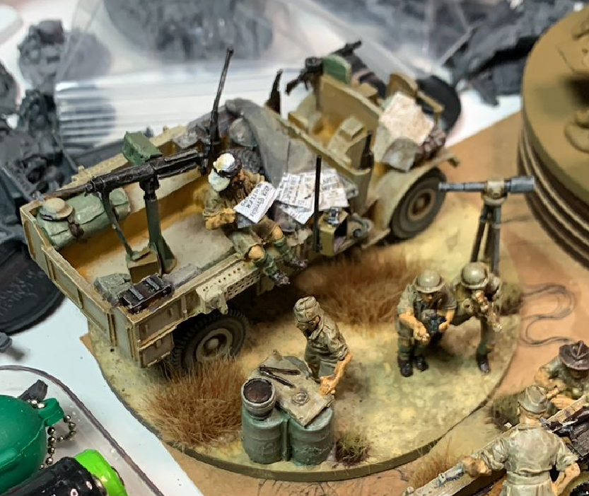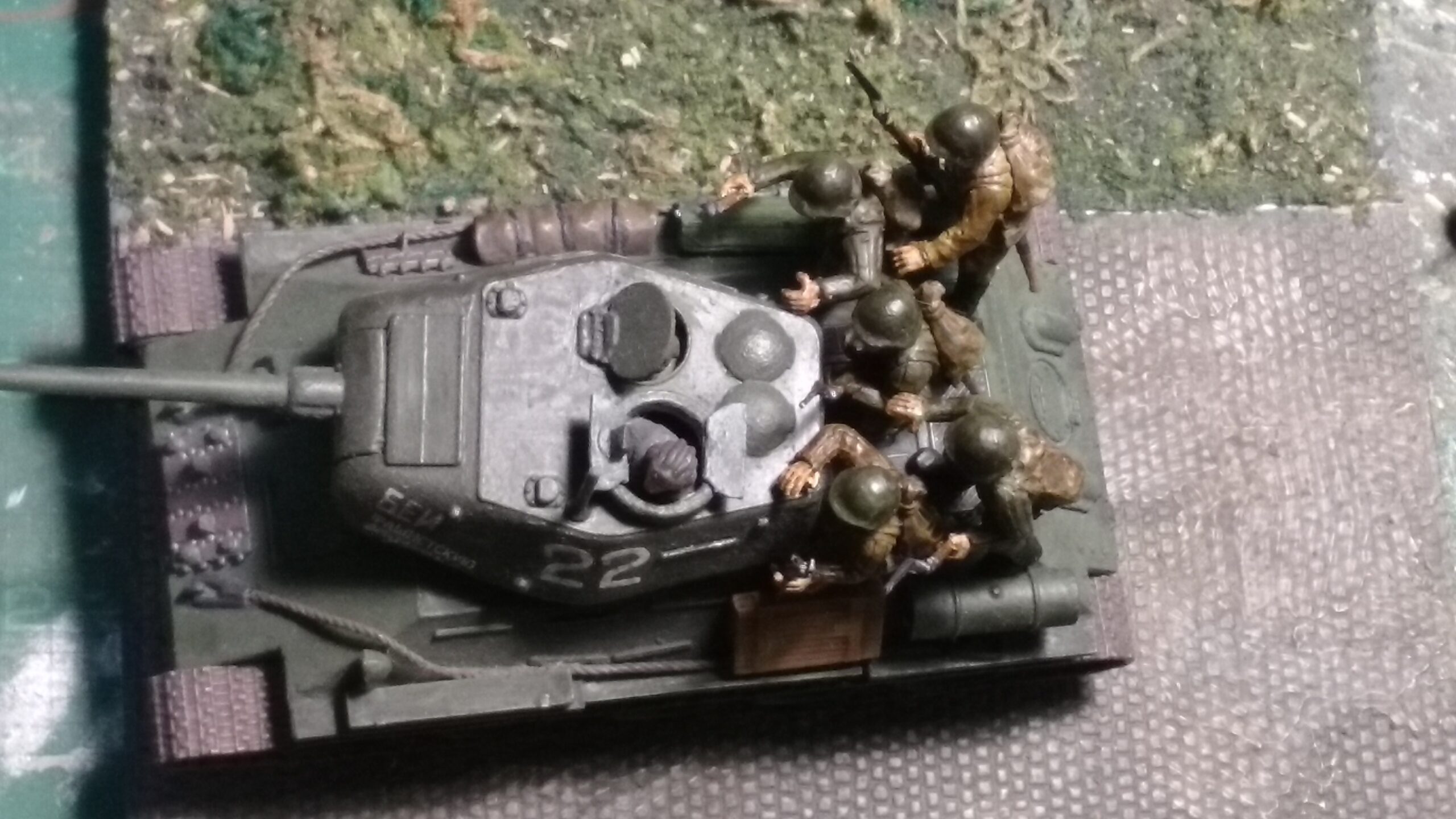 As I have said before I don’t play Bolt Action so I have no need to have removable tank riders , but if I did play I would have use 2 tanks , both, weathered, decaled and covered in stowage the same , one with glued on tank riders , the other empty . I would also have figures identical to the riders mounted on ground bases to use when dismounted . I’ve done the same with Japanese figures in fox holes , I use a removable half figure ( torso ) in the hole and have an identical painted and armed full figure for when they charge thus leaving an empty fox hole . This also means your fox hole is only 1/2 to 3/4 inch above the table unlike those GW trenches which IMO look like crap