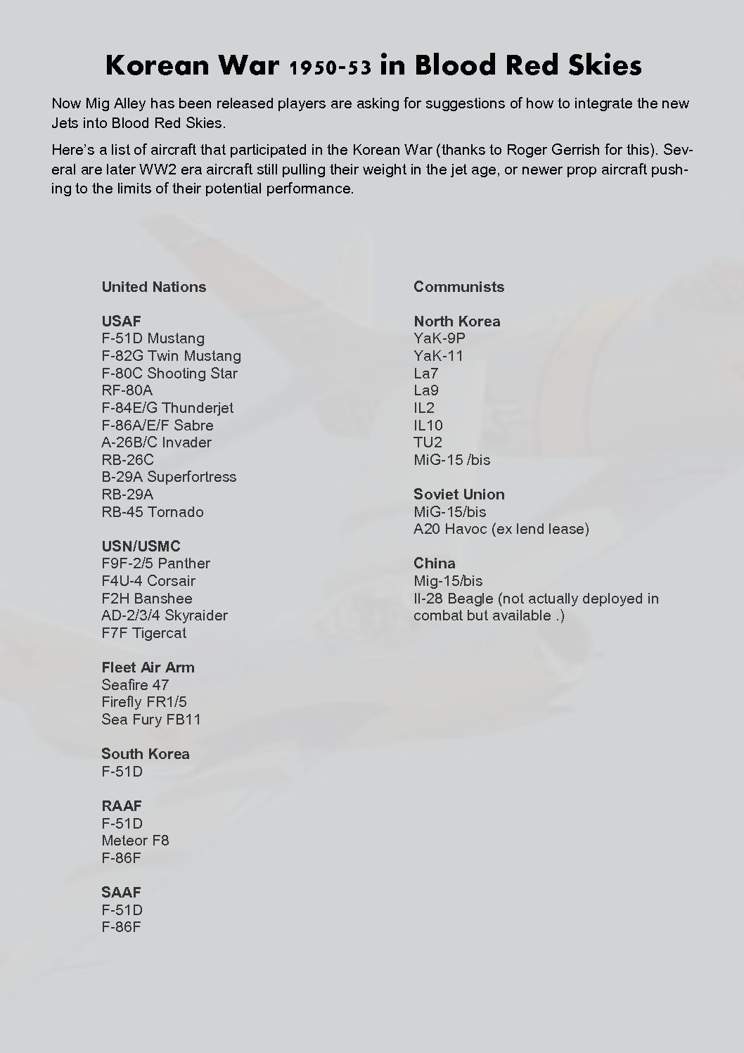ParticipantHi everyone. Please find attached some Theatre & Doctrines for Mig Alley. These are from the beta of the Air Strike supplement so can be thought of as semi official. We had hoped to release Air Strike at the same time as Mig Alley however this has been put back a little.