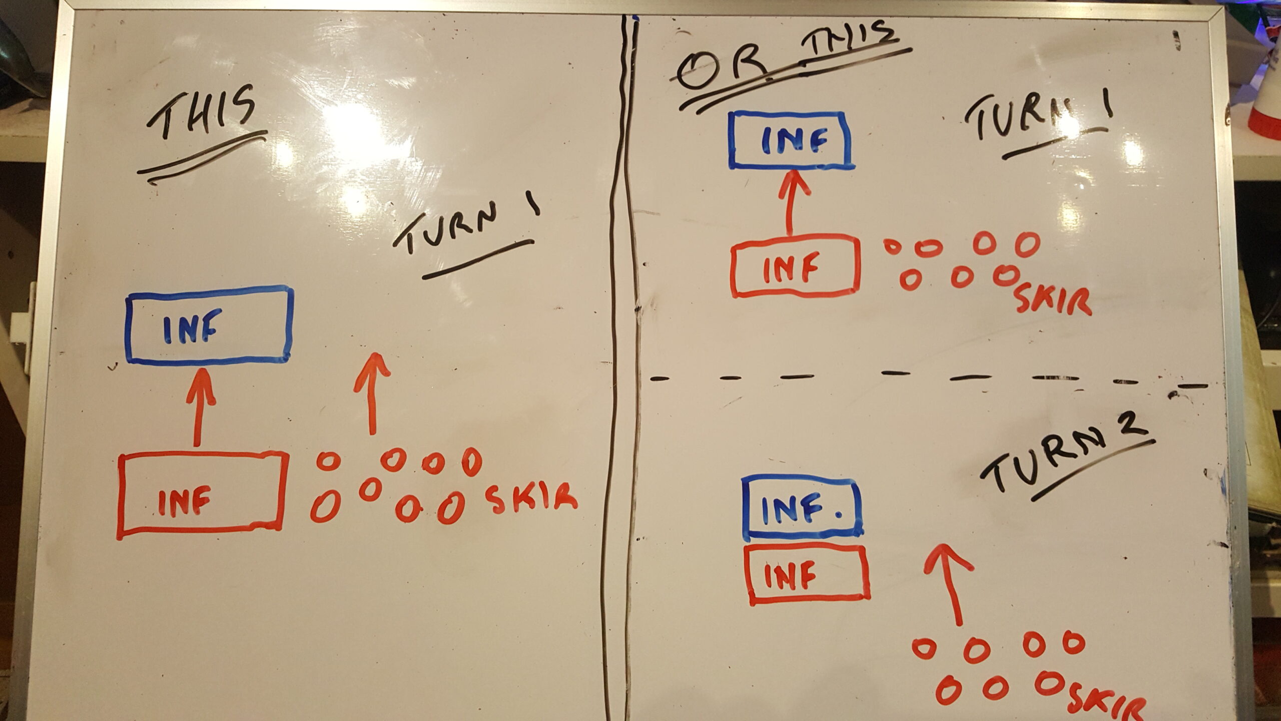 In the picture the red Infantry unit charges the blue Infantry unit and wants the Skirmish unit to support it in combat.