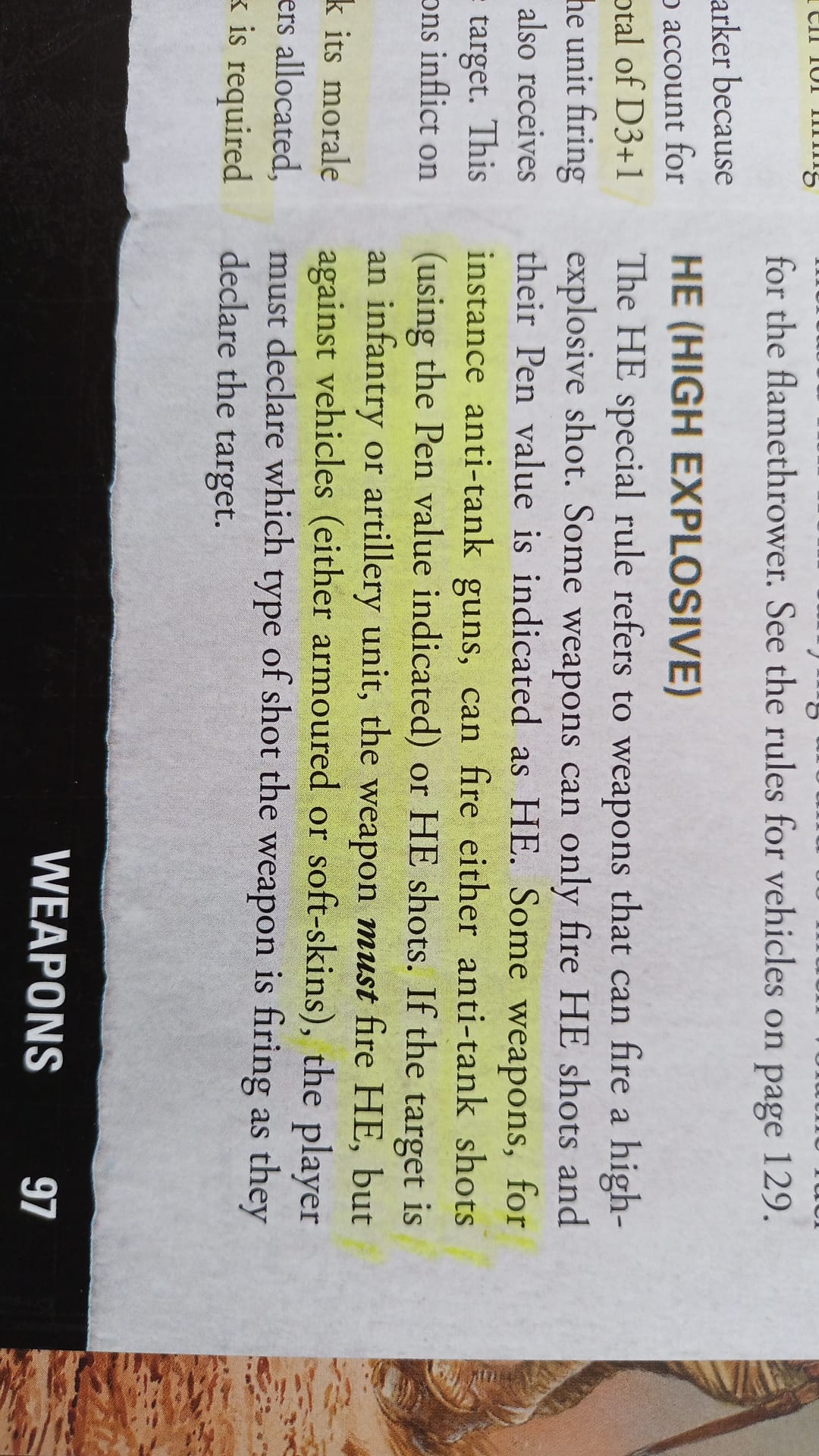 Kar98kParticipantYou are correct, sort of, because recorded and photographic history does show AP was used against soft-skins, but overall, I get what you are saying. However, the situation you speak of is just a simple workable game mechanic, but to to answer you question, a player might like to fire HE to get the splash damage on other units (e.g. medium howitzer has a 3 inch template).