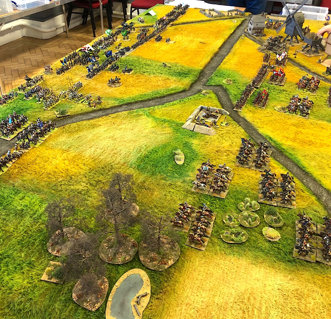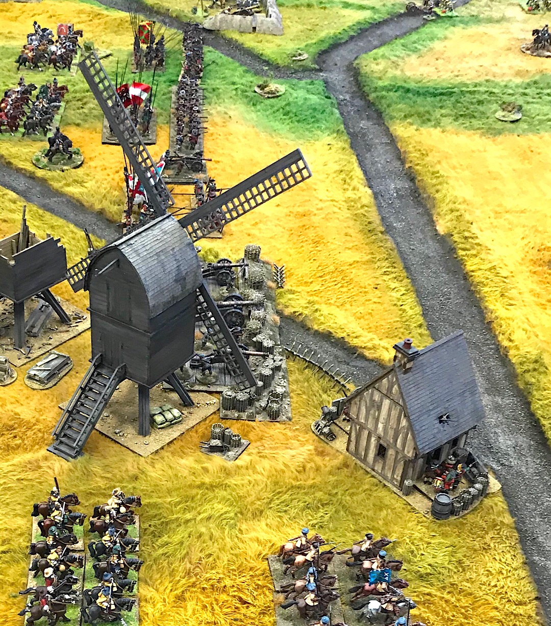 First of all we added the 3 windmills. One still to be painted! Now, this is where figure / terrain scale and ground scale clash badly. The model windmills will take up far more room that the actual windmills did. I think we can live with this, and we may need to shuffle them around during the game as they shouldn’t interrupt troop movement unduly. With the windmills down we could now add the windmill artillery battery, and also the miller’s house.