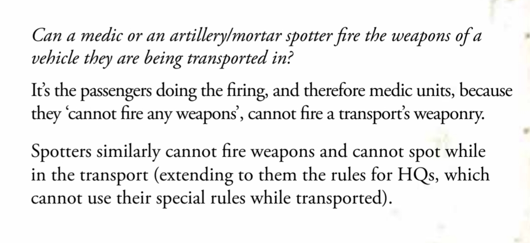 ParticipantThe reason I asked is because in the 2nd Edition FAQs this is exactly the explanation given for spotters not being able to spot from transports … because officers and HQ units’ abilities do not affect units outside the transport (refer to attached section) 🤷♂️ I believe in the 2nd Edition there was only one German vehicular unit that can act as a mobile spotter.
